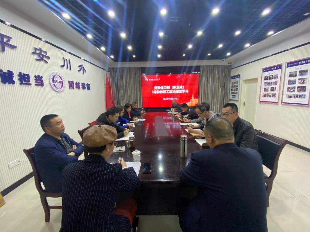 2022328日下午330分,保卫处全体职工在保卫处会议室集中参加本月政治理论学习。学习活动由范杰副处长主持,党政办副主任何智慧作为学校教职工政治理论学习巡听工作组成员出席会议。