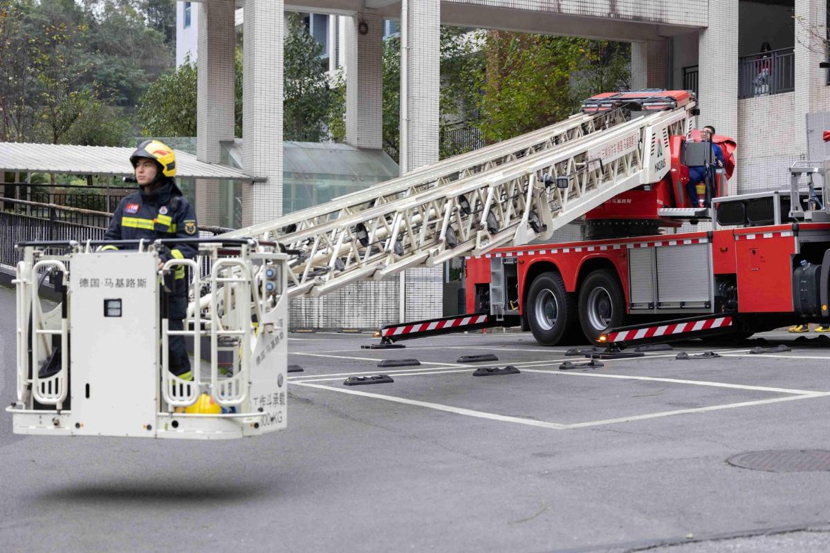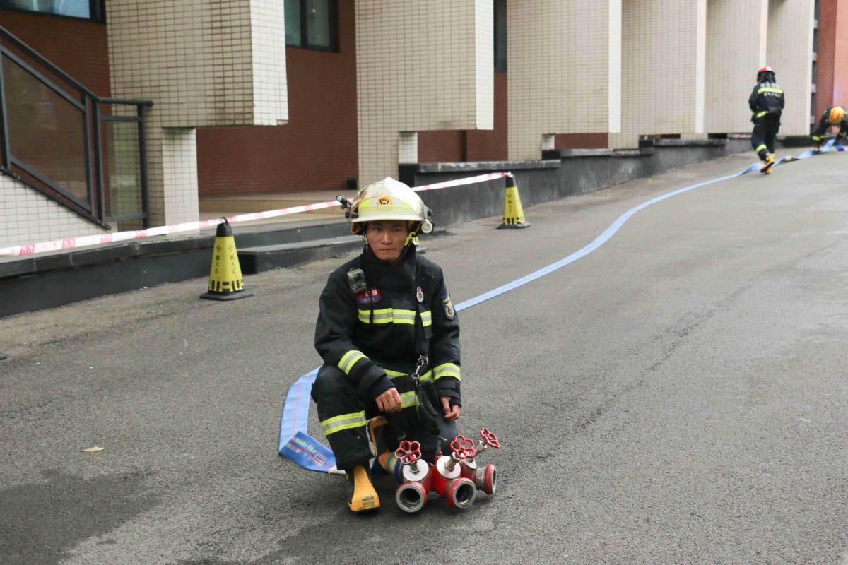 紧接着,三辆消防救援车第一时间赶到了“火灾”现场组织实施救援行动。一组消防员铺设水带、连接接口、打开阀门,高压水流直抵“火海”。另一组消防员操作云梯车,云梯快速升高、伸展,直达被困人员所在楼层,成功解救“被困学生”并转移至安全区域。