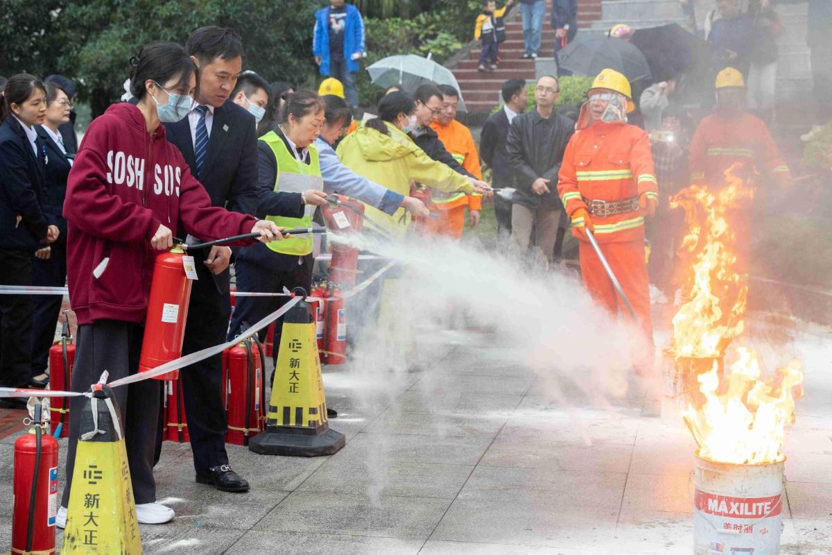逃生和救援结束后,全体参与演练师生来到学校钟楼广场,磁器口消防救援站专业技术干部余炘林为师生详细讲解了消防器材的正确使用方法,并现场演示了灭火器灭火的操作步骤。师生在工作人员的指导下有序使用灭火器进行灭火。