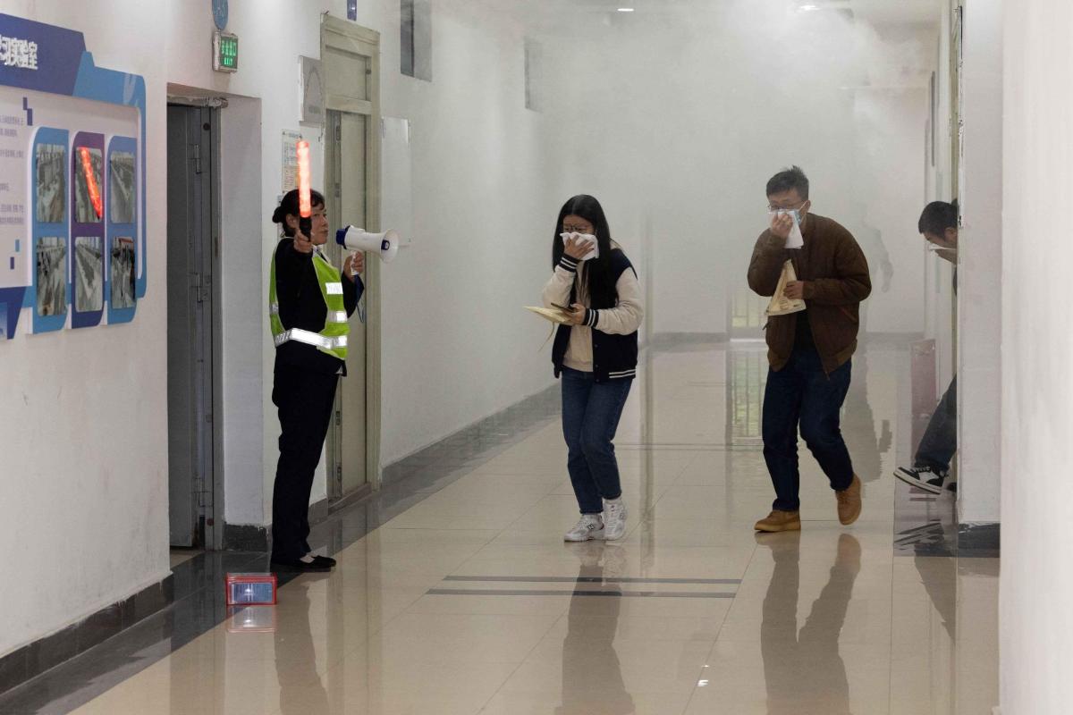 “嘟……”随着警报声骤然响起,演练正式拉开帷幕。教室外面浓烟弥漫,正在实验室上课的老师和同学们迅速用湿毛巾捂住口鼻,在疏散引导员的有序组织下,弯腰低姿沿着预定疏散通道快速撤离教学楼,同时学校义务消防队员迅速赶往现场进行应急处置。整个疏散过程有条不紊,仅用3分钟,全体师生便安全疏散至指定集合点。