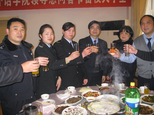 2008年2月6日除夕佳节,李克勇校长亲临保卫处,对在春节期间坚守岗位的保卫干部和校卫队员表示了亲切的慰问,并给优秀校卫队员颁奖,与大家共进团年午餐。李校长就春节期间的安保工作作了重要指示,鼓励大家认真工作,确保在校师生员工度过一个平安祥和的春节。这是李校长连续三年来与保卫处校卫队员一起过春节。