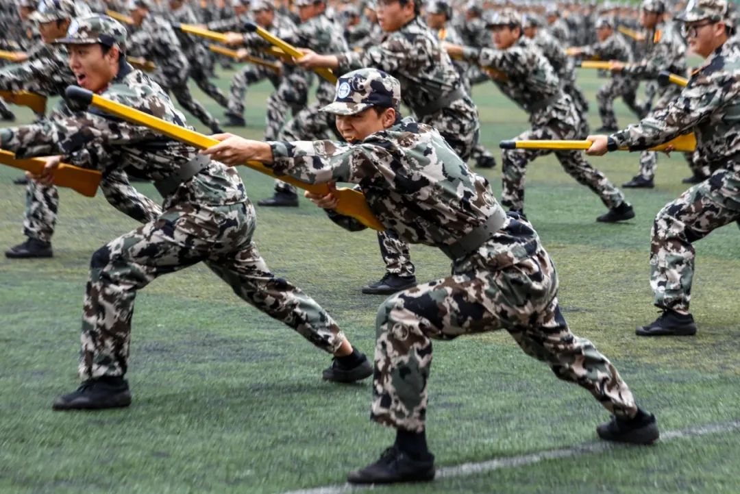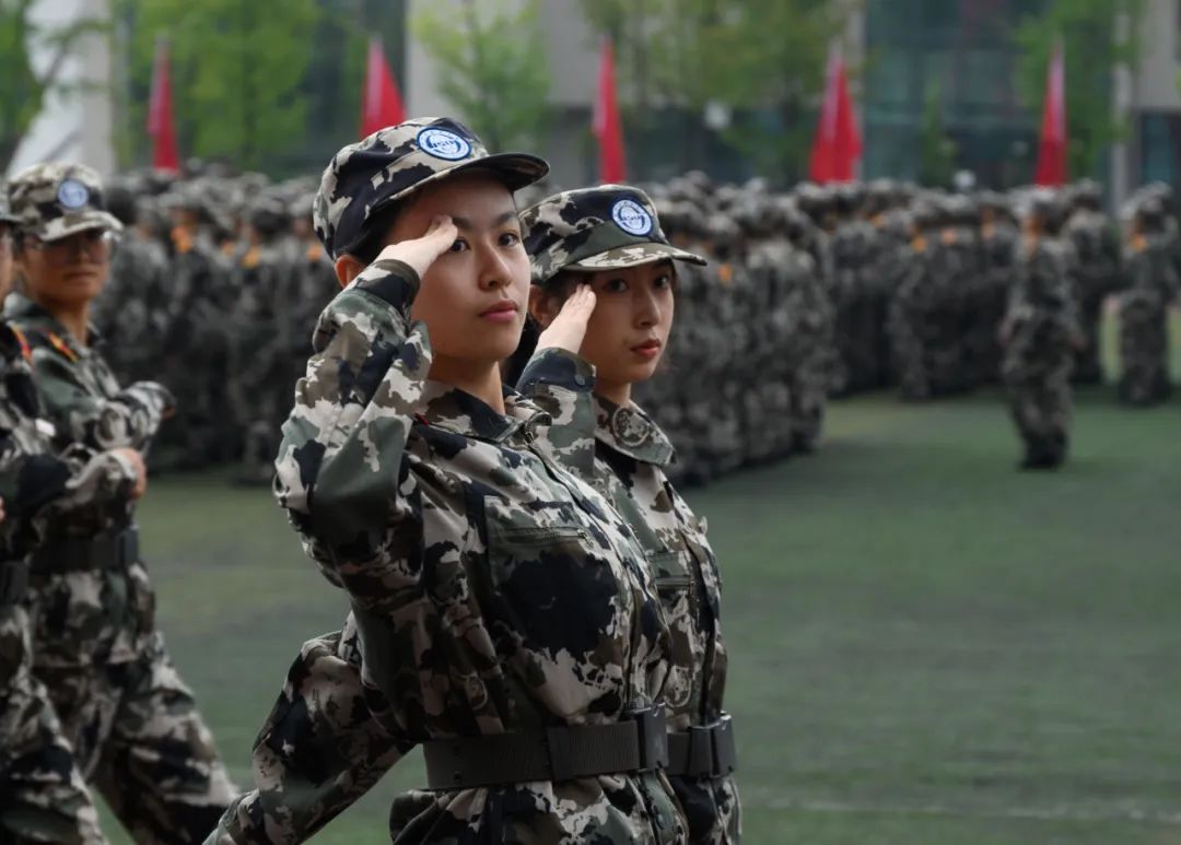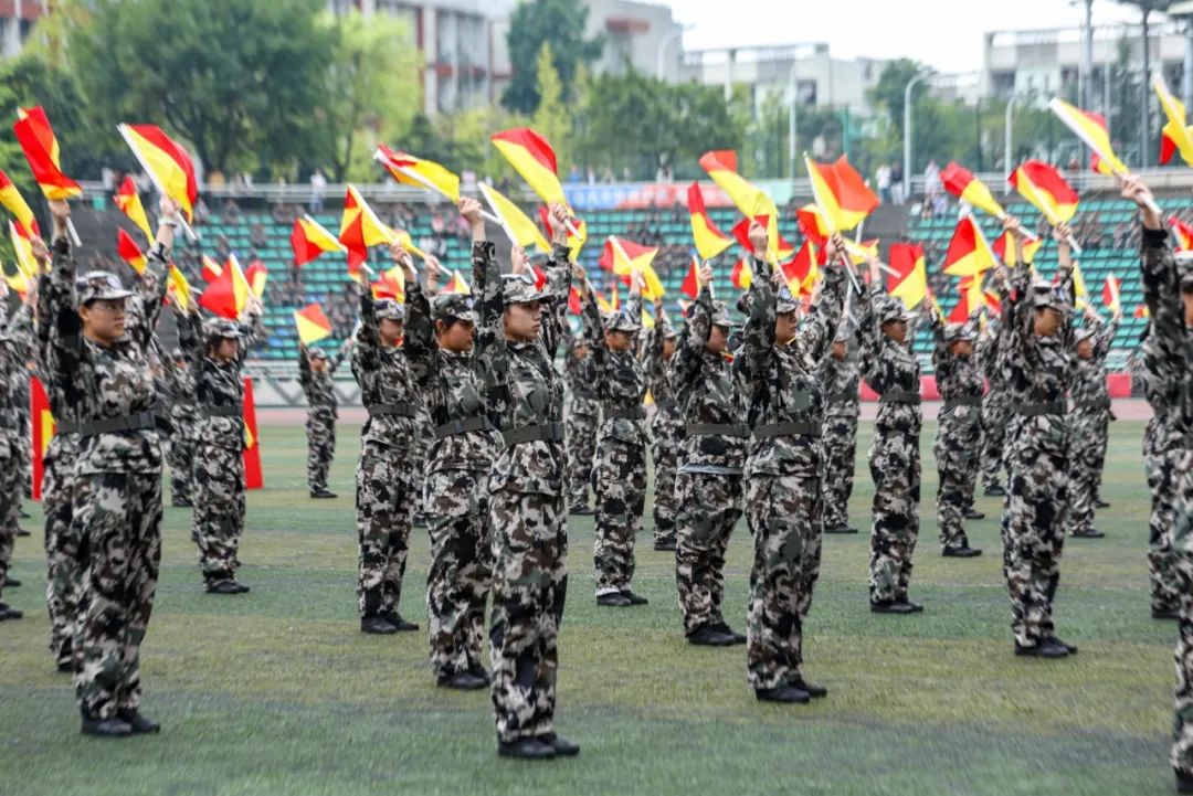 会操完毕,军训汇报表演开始。在承训教官的哨声下,新生们分别展示了应急棍术、女子匕首操、旗语表演,汇报他们的军训成果。他们的呼号直冲云霄,动作利落整齐,展现出川外青年朝气蓬勃的风采。