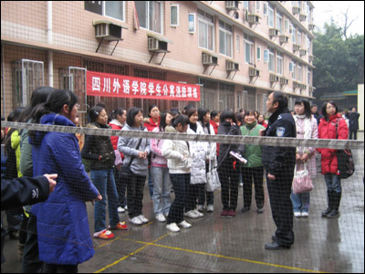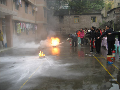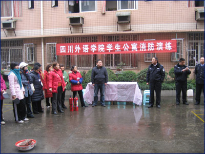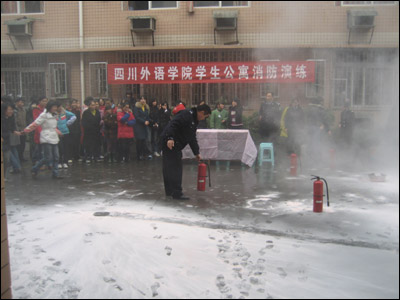 消防演练正式开始之前,保卫处处长李澄讲话。他讲道,20081114610许,上海商学院学生宿舍发生火灾,4名学生慌不择路从6楼跳下当场死亡。李澄指出,生命的代价,惨痛的教训,认真做好消防安全工作事关学校的安定和发展,同时,消防工作与每位同学息息相关,希望每位同学自觉遵守公寓管理规定,防患于未然,杜绝消防事故的发生。之后,保卫处消防管理员张宏讲解了防火防雷的安全知识、火险逃生自救方法、学校火灾发生的原因,讲解了灭火器的性能和使用方法并作了现场演练。