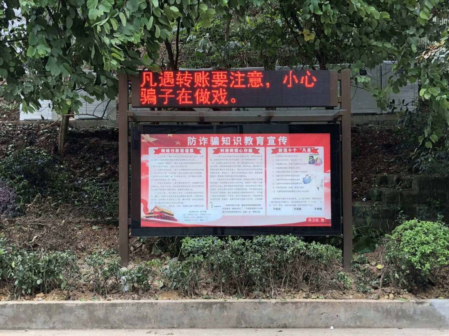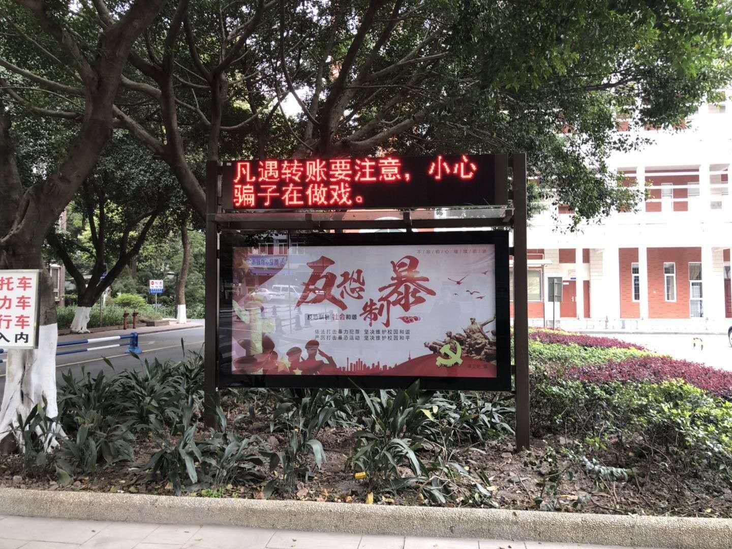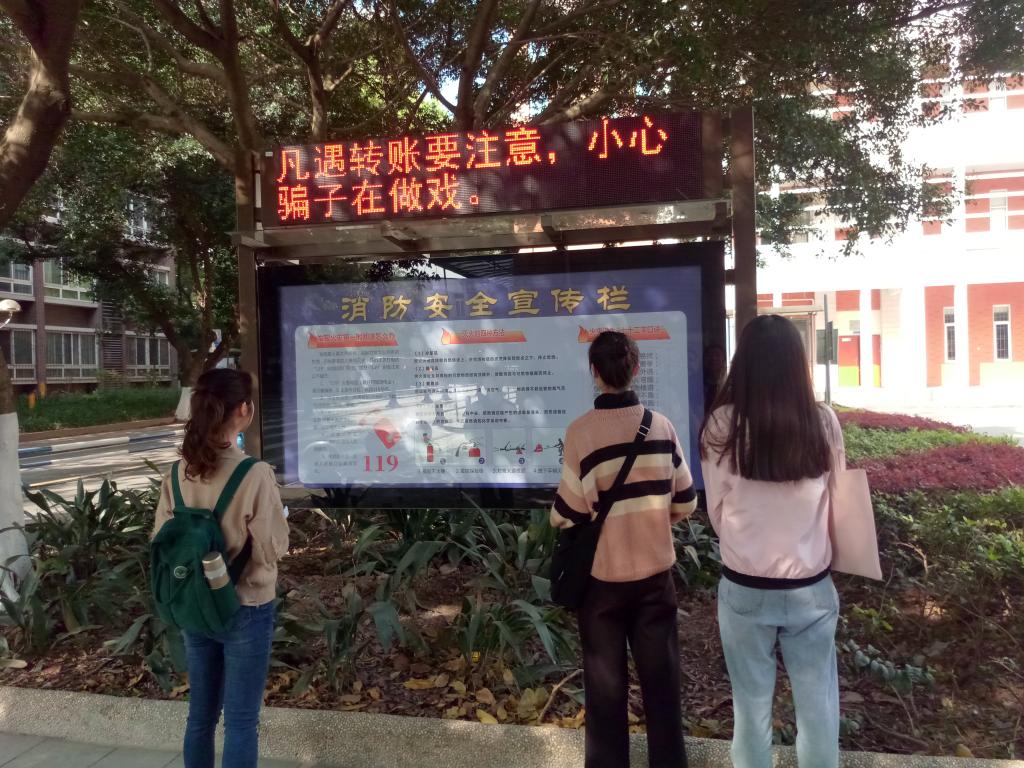 多媒体宣传栏自动循环显示有关防范电信诈骗、盗窃以及交通安全、消防安全、反恐防爆、防灾减灾、逃生自救等多方面的安全常识和技能。宣传栏内容每月更新1次,每天早上7:00-晚上11:00运行,内容新颖、醒目,吸引了大量师生驻足观看,弥补了传统宣传展板的不足,收到了良好的安全教育效果。