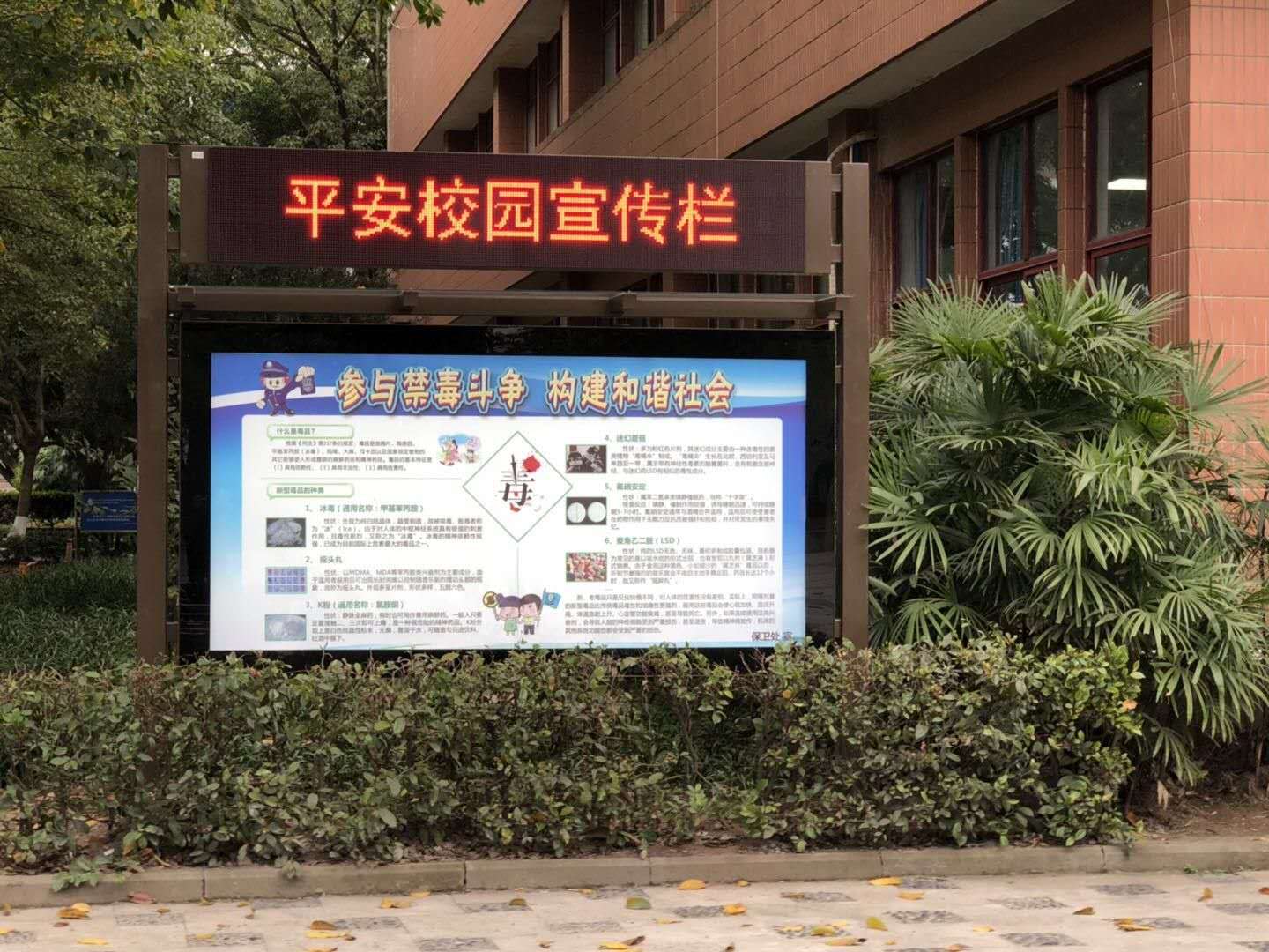 为进一步加强校园安全教育宣传,提高广大师生的法治意识、安全防范意识和自我防护能力,近日,保卫处与南京妙策传媒有限公司合作,在校内人流量大的重点部位安装了4块校园安全多媒体宣传栏。