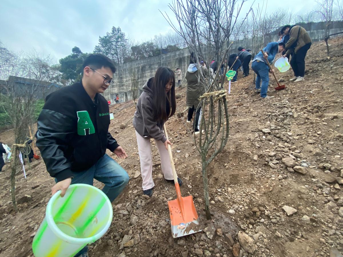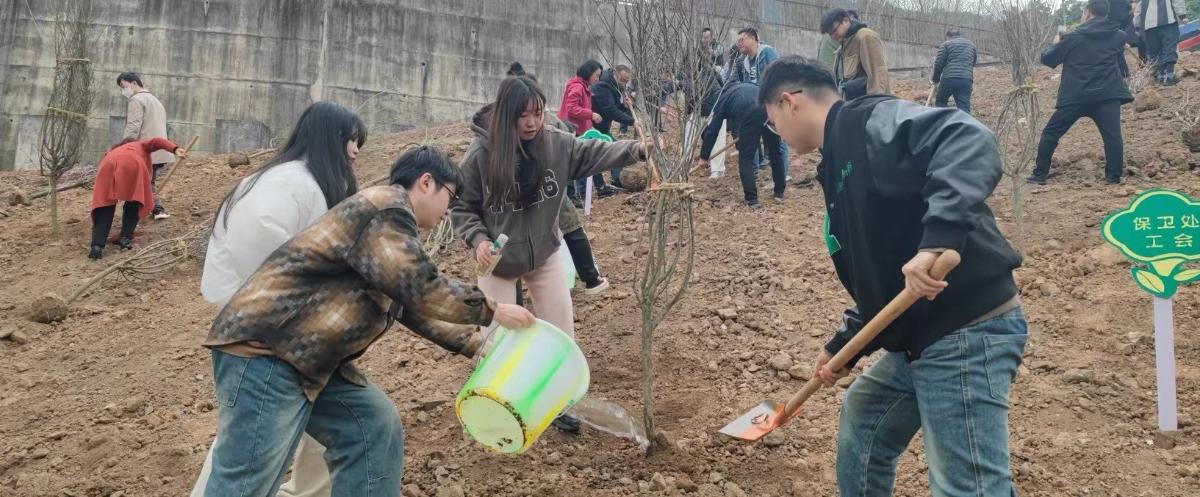 植树活动现场,志愿者们来到渣滓洞景区附近,按照植树要求和标准互相配合,挥锹铲土、扶树正苗、浇水灌根,合力种下一株株树苗,齐心造就未来锦绣春色,整个场面呈现出一片热火朝天的劳动景象。