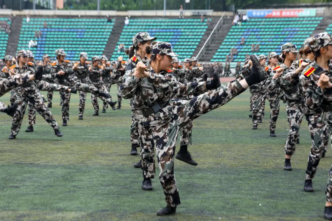 会操完毕,军训汇报表演开始。在承训教官的哨声下,新生们分别展示了应急棍术、女子匕首操、旗语表演,汇报他们的军训成果。他们的呼号直冲云霄,动作利落整齐,展现出川外青年朝气蓬勃的风采。