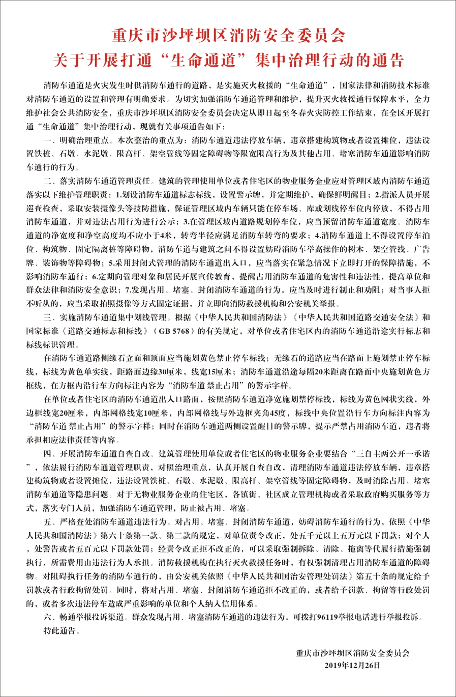 重庆市沙坪坝区消防安全委员会关于开展打通“生命通道”集中治理行动的通告