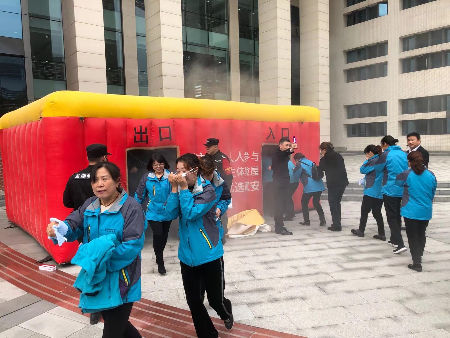 讲座结束前,姚教官向大家强调了模拟火场逃生屋疏散演练的训练要点和注意事项。随后所有人员在疏散引导员的指挥下,有序地从逃生屋入口猫腰捂鼻进入,迅速安全地从逃生屋疏散出口撤离到指定位置。