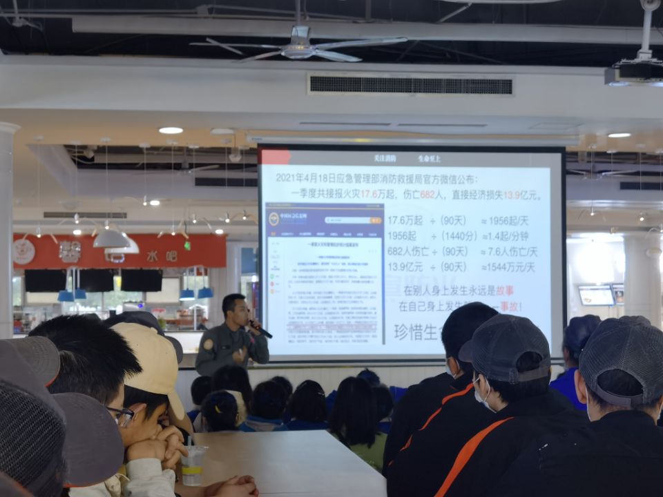 培训分为消防安全知识讲座、模拟火场逃生训练和消防实战演练三个部分。在消防知识培训环节中,教官为受训人员普及了校园火灾预防、初期火灾扑救和火场逃生自救等消防安全知识,并结合我校实际情况,对宿舍和食堂火灾的预防进行了详细讲解,对日常生活中应注意的消防安全事项进行了提醒。